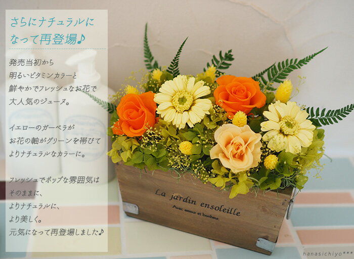イエローのガーベラとオレンジのバラのビタミンカラーがかわいい大人気のプリザーブドフラワーアレンジ"ジューヌ" ガーベラがよりナチュラルなお色になって再登場です♪