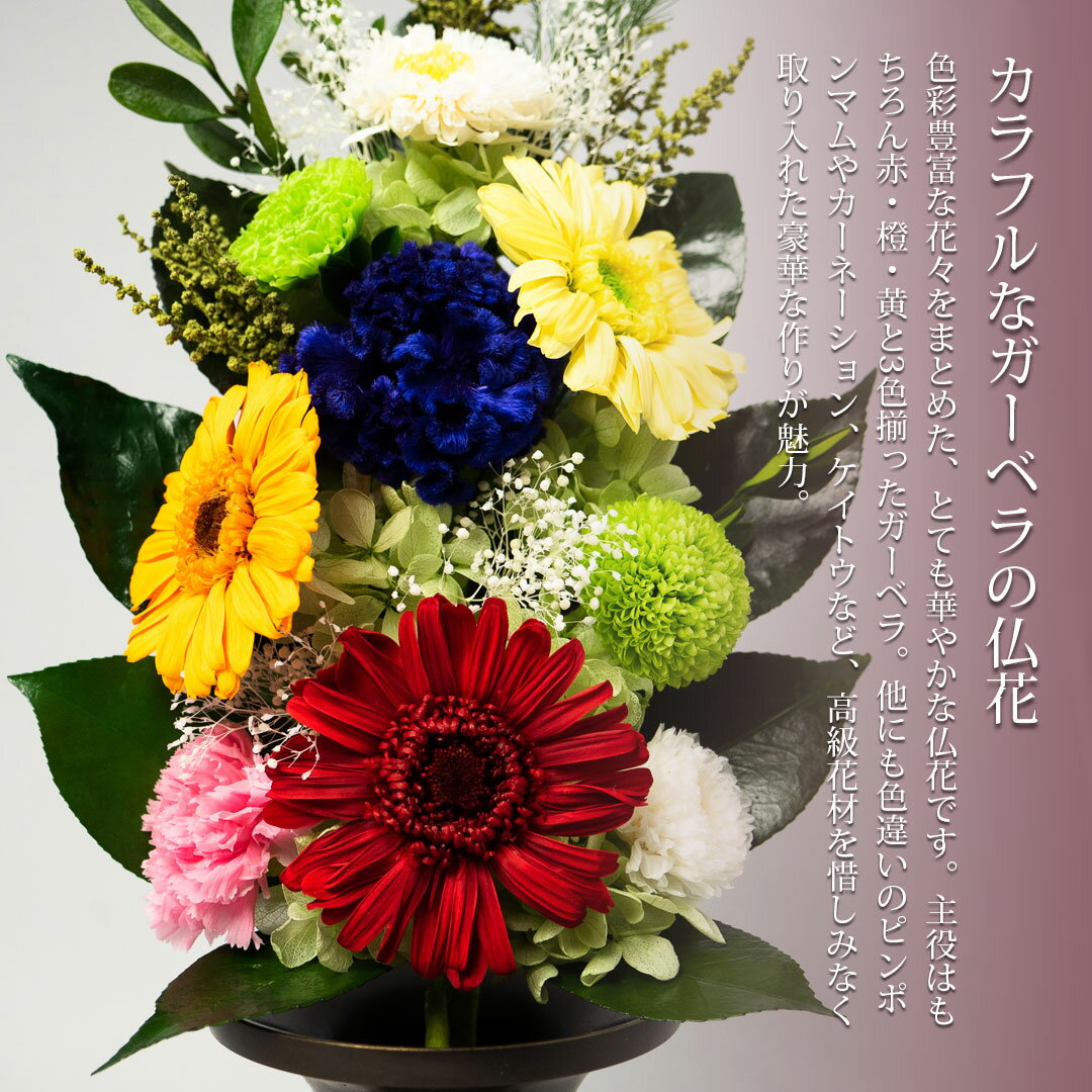 色とりどりなガーベラの仏花 色彩豊富な花々をまとめた、とても華やかな仏花です。